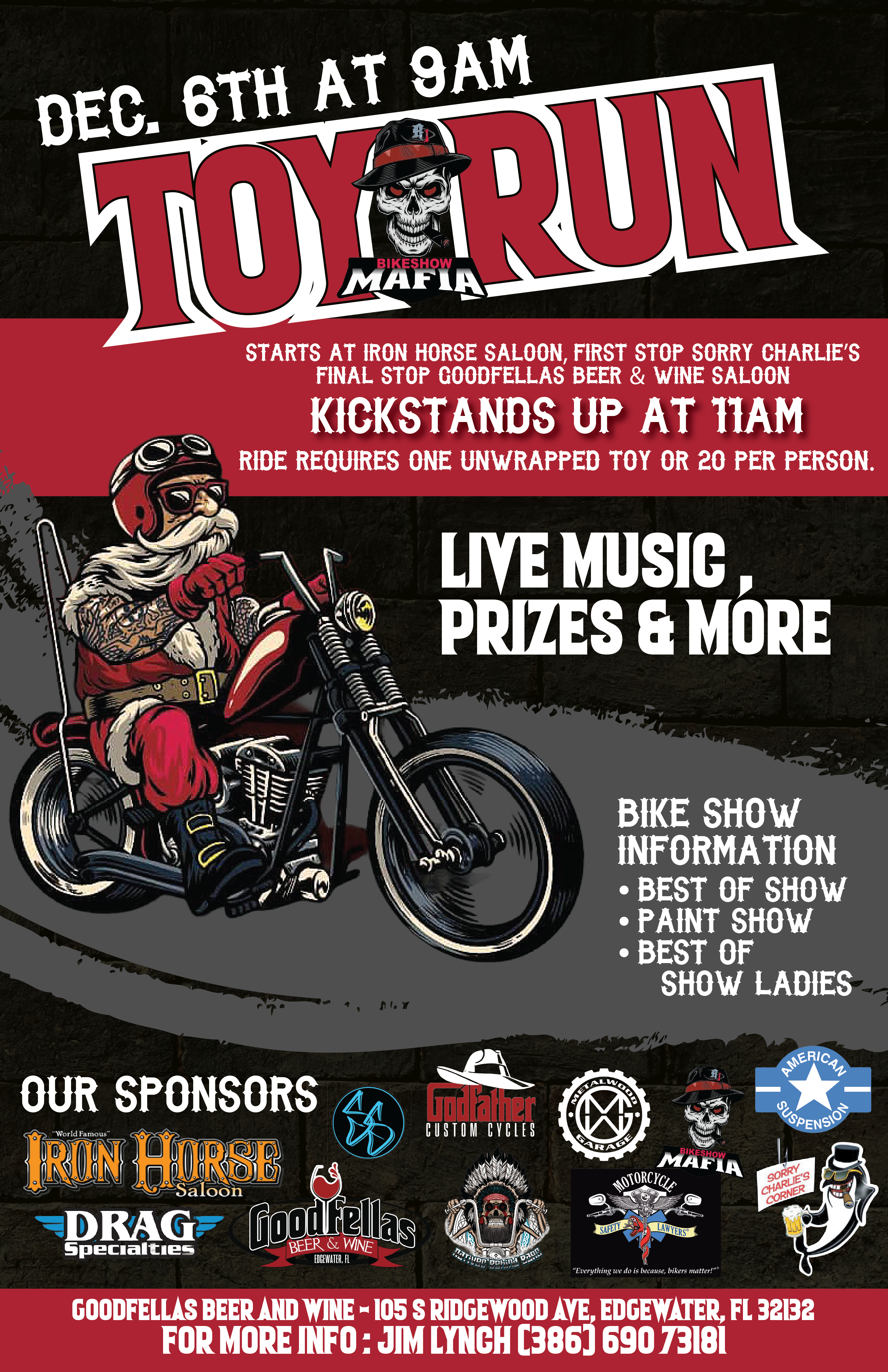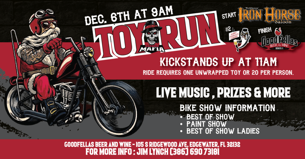 The Toy Run flyer set the tone for the partnership. Designed to embody both holiday spirit and community purpose, it features strong Christmas reds, metallic accents, and a gritty biker aesthetic that blends heart and horsepower. The layout captures the charitable energy of the event while keeping readability high for both mobile and print versions. Every design element — from typography to border treatments — was created to reflect the cause and the camaraderie behind it.